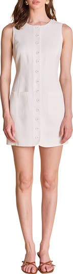 Tonal buttons and flattering darts saunter down the front of a sleeveless minidress rendered in an airy linen blend and punctuated with a pair of patch pockets.