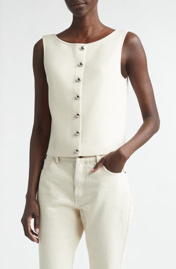 Italian sculpted metal buttons instantly elevate this boxy, semi-fitted sweater-vest that's crafted from compact jacquard in signature matte-crepe yarn.