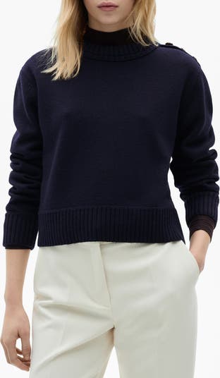 Glinting nautical-themed buttons trim this woolly drop-shoulder sweater topped with a mock neck for warmth and sophistication.