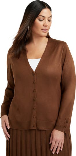The subtly cropped design of this v-neck cardigan looks great over a dress or tucked-in tee and your go-to denim. Brown covered buttons on the front and at the sleeve cuffs add a smart touch. Set-in sleeves. Rib trim.