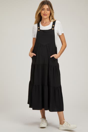 Elevate your style with our Black Button Sling Tiered Maternity Midi Dress. Designed with comfort and versatility in mind, this dress features adjustable spaghetti straps, functional front buttons, and a flattering tiered silhouette that gracefully adapts to your growing bump. The breathable, lightweight fabric ensures all-day comfort for any trimester and beyond. Dress it up with sandals for an event or keep it casual with sneakers for everyday outings. Perfect for baby showers, brunches, or simply lounging in style—embrace effortless elegance throughout your pregnancy and after. Shop now for a maternity staple you'll love!