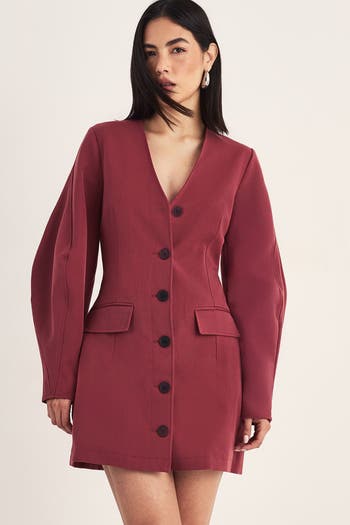 Striking cocoon sleeves create a contemporary silhouette with dramatic volume. Plunge neckline adds a touch of allure to this structured blazer dress. Functional front pockets provide practical storage whilst maintaining the tailored aesthetic. Button-through front design with contrasting buttons for a sophisticated finish. Mini length showcases legs whilst the structured shape maintains a smart appearance.