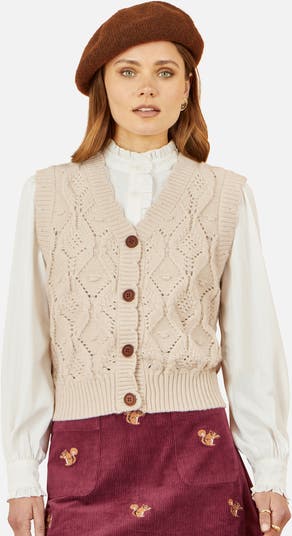 This sleeveless knitted style is perfect for the changing season. The cable design is pretty and add a feminine flair to this everyday piece. Simple design, easy to style with denim, a V neckline and button up design make it perfect for wearing over a shirt.