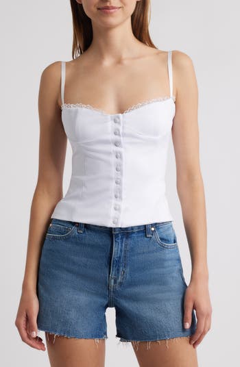 Dainty lace trims and tonal buttons highlight the corset-inspired bodice of a stretchy top fitted with adjustable straps for customized wear.