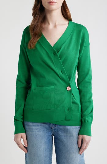 A versatile wrap front brings styling flexibility to this cotton cardigan designed with a traditional button-front closure that can also fasten in a crossover silhouette.