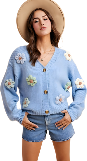 Button-Up Flower Embellished Cardigan