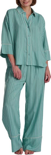 Dream sweetly in this comfy pajama set including an oversized button-up shirt framed by three-quarter sleeves and matching pants finished with handy pockets.