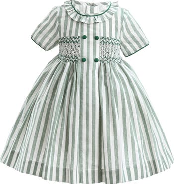 A charming nod to vintage style, this green and white striped dress blends timeless elegance with playful detail. From its smocked bodice to the full gathered skirt, every element is designed to delight. Oversized self-tie bow at the waist adds volume and vintage flair. Full gathered skirt and ruffled neckline complete the timeless look.