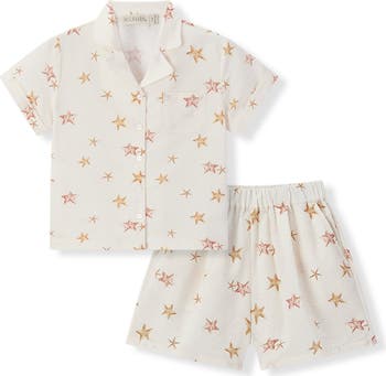 Button-Up Two Piece Set features a classic shirt and shorts in a breathable cotton with bright coastal flair. A soft button-up front and matching elastic waistband shorts make dressing simple and stylish. Milkbarn's prints radiate warmth and ocean color.