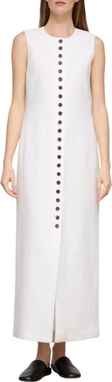 Contrast buttons highlight the slim silhouette of this sleeveless maxi dress that features the house's signature meticulous tailoring in breathable linen with a naturally light, body-skimming drape.