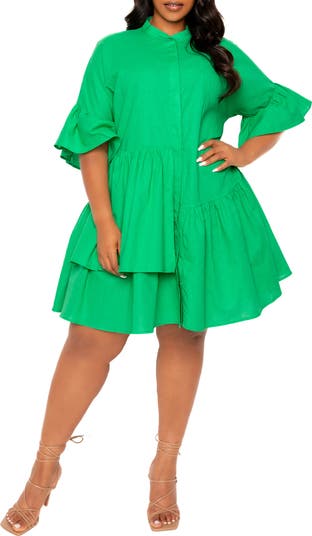 A zesty hue really pops on this flouncy cotton-and-linen shift dress fashioned with an asymmetric dropped waist and elbow-length flutter sleeves.