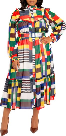 Primary-colored checks make a vivid statement on this belted maxi designed with floaty frills for graceful movement.