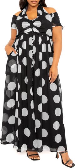 Mod polka dots add charming retro allure to this maxi dress designed with a halter neck and off-the-shoulder styling for a flirty touch of skin.