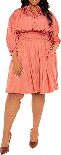 Move flawlessly from desk to dinner in this rich satin shirtdress designed with shaping waistline smocking.