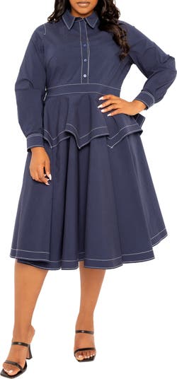 A perky peplum adds a hint of whimsy to a cotton-blend shirtdress traced with topstitched outlines.
