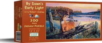 Capture the serene essence of dawn with the "By Dawn's Early Light" 300 piece jigsaw puzzle by SunsOut. Featuring a tranquil landscape and a deer, the puzzle showcases the splendid artistry of Robert Andrea, offering a therapeutic escape from the everyday hustle. Each piece of this USA-made masterpiece interlocks seamlessly thanks to the meticulous craftsmanship of SunsOut Puzzles. Built from high-quality recycled cardboard, the puzzle promises longevity and with completed dimensions of 16" x 26", it is a magnificent addition to any room. SunsOut's reliable customer service ensures a worry-free assembly, swiftly resolving any issues with missing or damaged pieces. The brand also emphasizes eco-friendly craftsmanship, using soy-based inks and recycled board, reinforcing its commitment to the environment. With "By Dawn's Early Light," you're not just assembling a puzzle; you're embarking on an artistic journey through nature's splendor. Ideal for seasoned puzzlers or curious beginners, it provides the perfect balance of challenge and enjoyment. As a product of SunsOut, a proud woman-owned small business, each puzzle reflects the dedication, care, and precision put into the manufacturing process, while also celebrating diversity and excellence.