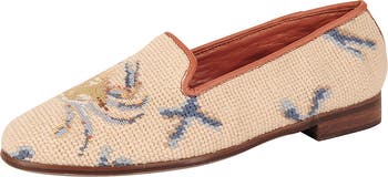 A cushioned footbed and leather lining offer lasting comfort in this classic flat enlivened with a needlepoint crab stitched by hand.