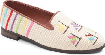 A cushioned footbed and leather lining offer lasting comfort in this classic flat enlivened with a nautical-inspired needlepoint print stitched by hand.
