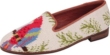 A cushioned footbed and leather lining offer lasting comfort in this classic flat enlivened with a needlepoint parrot stitched by hand.