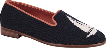A cushioned footbed and leather lining offer lasting comfort in this classic flat enlivened with a needlepoint sailboat stitched by hand.