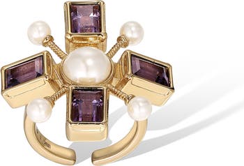 Architectural ring inspired by Byzantine court with layered stone inlays for a regal statement look.