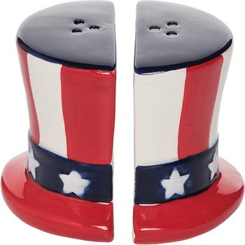- Styled as classic Uncle Sam hats with stars and stripes detailing, each shaker showcases bold red, white, and blue colors. The cohesive patriotic design creates a festive accent that complements themed table settings and Americana décor.
