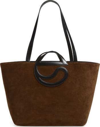 Coperni's form-and-function logo is deployed as integrated leather top handles on this minimalist tote shaped from supple calfskin suede and augmented by shoulder straps.