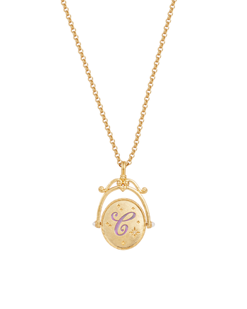 Our vintage style gold spinner initial necklace makes a wonderful gift or treat yourself as an act of self-love. Set in 22ct worn gold brass, on one side you'll find your 'C' initial engraved in a beautiful scroll font, on the other side, a hand-painted cornflower. Representing purity and hope, it will take centre stage in any jewellery collection.