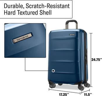 Elevate your travel experience with the Samsonite Octiv Lightweight Hard Shell Luggage collection, the perfect blend of style and functionality for the modern traveler. Crafted from durable polycarbonate and features a scratch-resistant coating that helps maintain a pristine look while preventing cracks and dents. Its ergonomic telescopic handle adjusts to 8 different heights, while the textured grip allows for easy one-handed maneuvering. Two soft carry handles provide convenient lifting options. Experience effortless mobility with patented 360-degree spinner wheels equipped with advanced Aero Trac Suspension Technology, which absorbs shocks and bumps for smooth and steady rolling in any direction. Stay connected on the go with a built-in USB port (just add your own external battery) and enjoy expandable zippers that add up to 1.5 inches of packing space. The spacious interior includes a snap-in packing cube, a WetPak pouch for liquids, and mesh pockets to keep everything organized. Travel with peace of mind thanks to the zipper latched recessed TSA-approved lock, ensuring your belongings are secure throughout your journey.