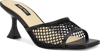 An angular square toe and sculptural flare heel add crisp angles and balance to a mixed-media slide sandal featuring a finely woven upper.