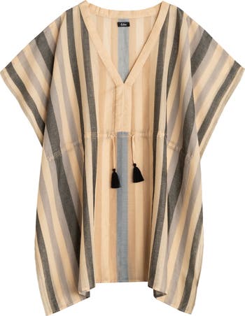 The Cabana Stripe Caftan is woven from 100% cotton, offering a lightweight and breathable drape perfect for warm-weather wear. Its bold stripe design adds a touch of coastal charm, while the relaxed silhouette makes it an effortless layer for beachside lounging or leisurely days in the sun.