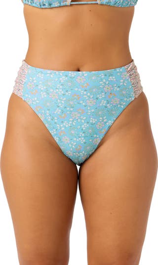 These high-waisted bikini bottoms are ready for some sunny-day fun with a beachy pattern, ruched sides and moderate back coverage.