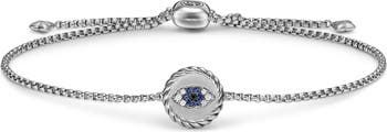 Ward off bad energy while looking stunning with a sparkling evil eye composed of sapphires and diamonds on a polished sterling silver bracelet.