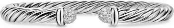 A cable spiral brings signature texture to a cuff bracelet made from sterling silver and detailed with endcaps lit up with pavé diamond.