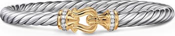 This cabled sterling silver cuff bracelet designed with a nitinol core for flex movement is centered with a 14-karat gold buckle traced in pavé diamonds. The signature cable began as a piece that David Yurman hand-twisted from 50 feet of wire and has since evolved into a myriad of designs.