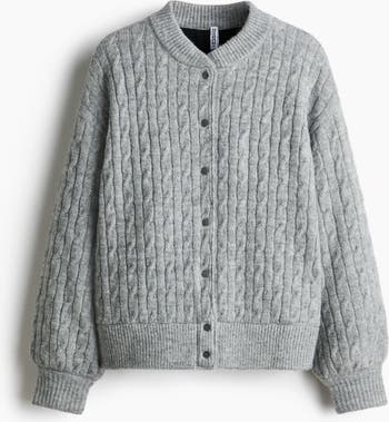 Loose-fit bomber jacket in a soft cable knit containing some wool. Ribbed stand collar and press-studs down the front. Dropped shoulders, long sleeves, and ribbing at the cuffs and hem. Lined.