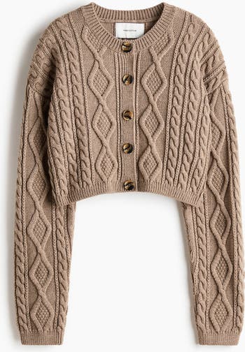 Short cardigan in a soft cable knit with a round neckline, buttons down the front, dropped shoulders and long sleeves. Ribbing around the neckline and at the cuffs and hem.