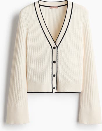 Short, fitted cardigan in a soft cable knit with accent-colour details. Features a rib-trimmed V-neckline, buttons down the front and gently flared sleeves. Ribbing at the cuffs and hem.