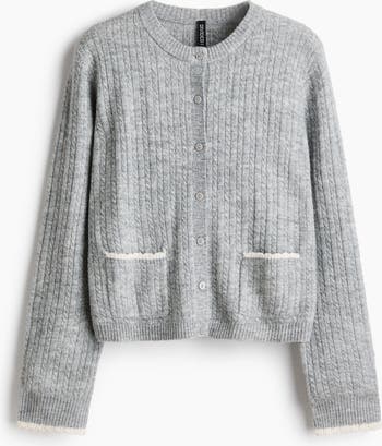 Short cardigan in a fine cable knit with a round, rib-trimmed neckline, buttons down the front, open front pockets with a scalloped trim, and ribbing at the hem. Long sleeves with ribbing and a scalloped edge at the cuffs.
