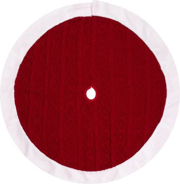 Add a touch of cozy charm to your holiday decor with our cable knit Christmas tree skirt. Crafted in a classic red hue and adorned with soft white faux fur trim, this delightful tree skirt brings warmth and elegance to any holiday setting. Its intricate cable knit design evokes memories of snug evenings by the fireplace, making it the perfect accent piece for your Christmas tree. Transform your home into a winter wonderland and create cherished memories with family and friends around this timeless holiday accessory. Product Features: Red Christmas tree skirt Cable knit design White faux fur border One-sided design Velcro closure in the back For indoor use only Care instructions: spot clean only Dimensions: 48" diameter Material(s): polyester/faux fur