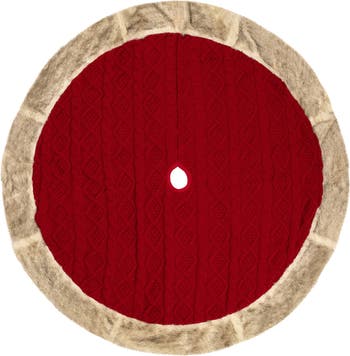 Cable Knit Christmas Tree Skirt with Faux Fur Trim- 48" - Red