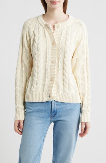 Two slightly contrasting yarns are plaited together to create nuanced color character in this cable-knit cotton cardigan, giving it a distinct sun-bleached patina. Raglan sleeves offer a roomy, more comfortable fit across the chest and shoulders.