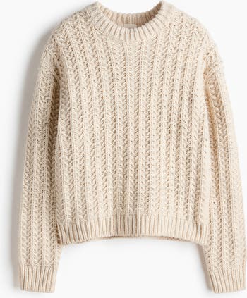 Jumper in a soft cable knit with a round, ribbed neckline, dropped shoulders and long sleeves. Ribbing at the cuffs and hem.