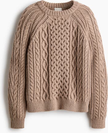 Jumper in a soft cable knit with a round, rib-trimmed neckline and long raglan sleeves with a pleat for added volume. Ribbing at the cuffs and hem.