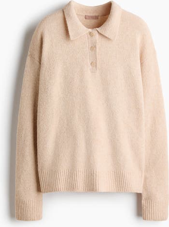 Loose-fit polo jumper in a soft cable knit containing some wool. Ribbed collar and a V-shaped opening at the front, dropped shoulders and long sleeves with ribbed cuffs. Ribbed hem with a slit at each side.