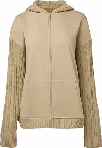 - A cable-knit hood and sweater sleeves define the oversized profile of this cozy fleece zip-up. It’s finished with a classic kangaroo pocket and ribbed trims. Cable knit sweater sleeves and hoodie Oversized fit Zip up front Kangaroo pocket 88% Cotton 12% Tencel Hand wash with cool water. Do not bleach. Do not tumble dry. Hang to dry. Do not iron.