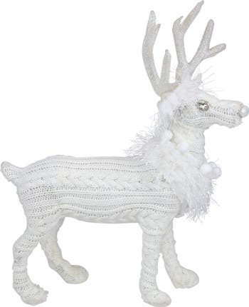 This majestic reindeer is a beautiful addition to any Christmas decor. Glittered antlers and jeweled eyes, give this piece the perfect amount of sparkle. Ideal for mantles, tables or under the tree. Product features: Reindeer in cable knit sweater Glitter embellished antlers Wears a p pom-pom scarf Fully dimensional design Dimensions: 13.5"H x 11"W x 3"D Material(s): plastic/polyester