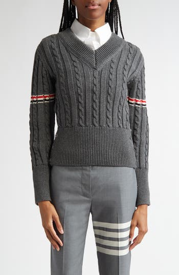 In classic Thom Browne fashion, red, white and blue stripes star on this ultracozy cable-knit sweater knit from warm virgin-wool yarns and detailed with grosgrain accents.