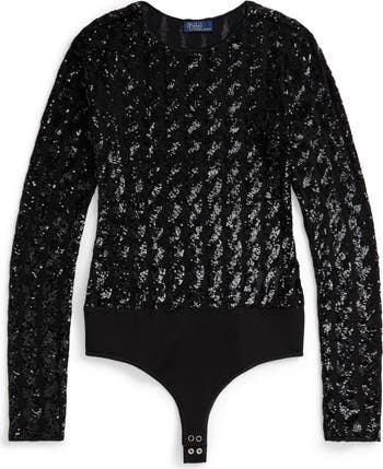 Lustrous cable sequins shimmer and shine on a soiree-ready bodysuit framed by pronounced shoulders and long sleeves.