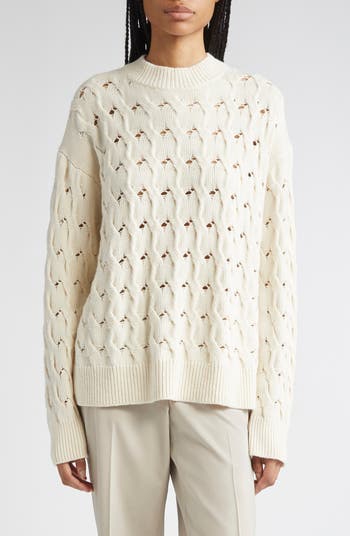 The NY-based label elevates the classic crewneck sweater in a chunky, open cable stitch knit from exceptionally soft and light cashmere-silk yarn. The relaxed shape is finished with ribbed trim that lends structure to the semisheer design.